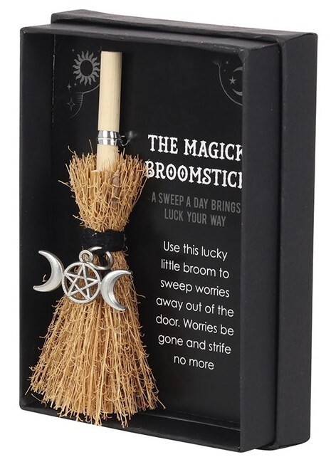 This approximately 4 inch long besom is made of twigs and tied with a ribbon that has a triple moon and pentacle charm hanging from it.
