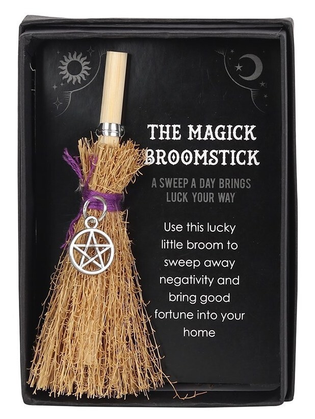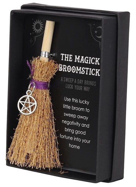 This approximately 4 inch long besom is made of twigs and tied with a ribbon that has a pentacle charm hanging from it.