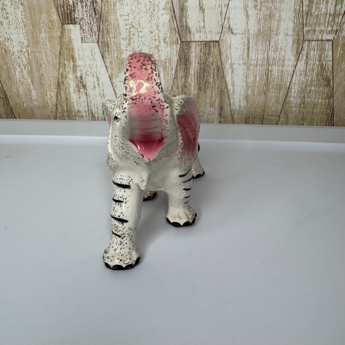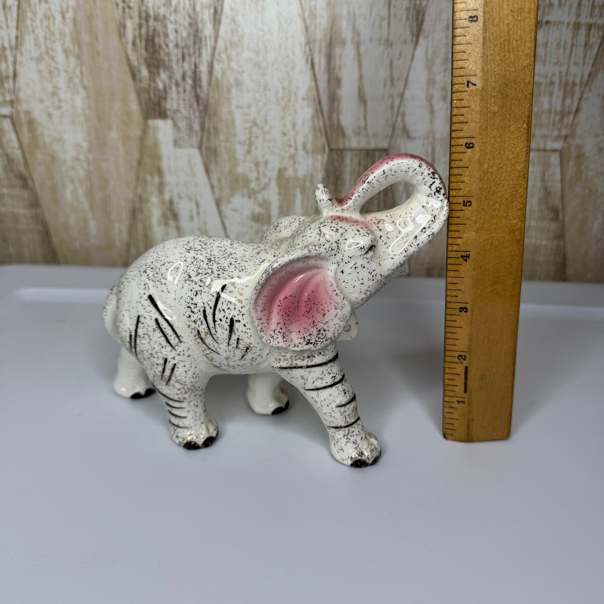 Vintage Ceramic Elephant Figurine Pink Ears Speckled Design Trunk Up Lucky Charm