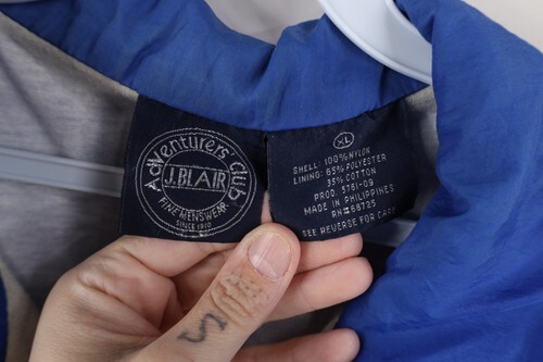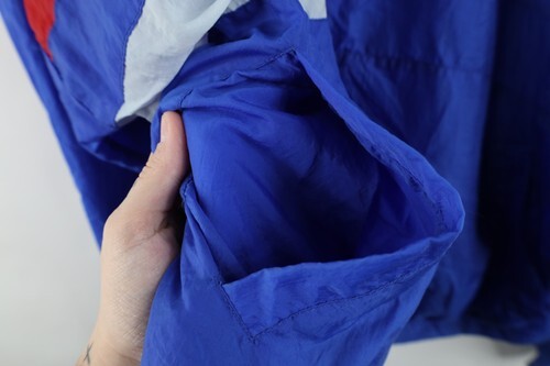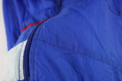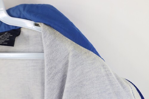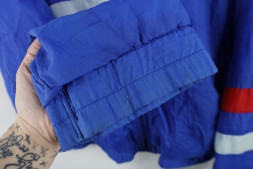Hole/ripped left shoulder. Blemishes/stains throughout, and cuffs. Inner lining discolored, blemished/pilled. Loose threads front, bottom hem, back. Cuffs, bottom stretched. Collar, cuffs, bottom discolored. Color faded
