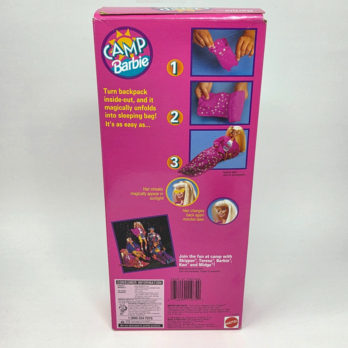 VINTAGE 1993 MATTEL CAMP BARBIE DOLL COLOR CHANGING HAIR ORIGINAL BOX # 11074