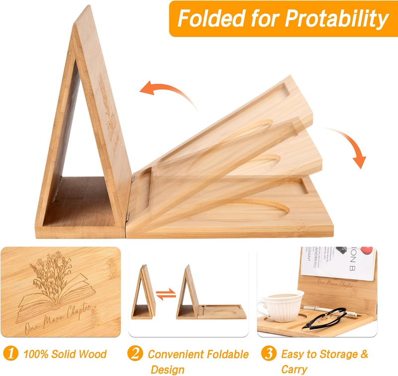 ?Unique Functional Design? This triangluer book nook holder has a unique folding design with funny promt words" One More Chapter ", can be folded to save the room when you don?t use, also easy to carry, so simple and convenient book minder for book lovers. Beyond just a book holder, this triangular wooden book valvet has the tray for coffee mugs, cell phone, glasses,and pens, blending seamlessly into any room