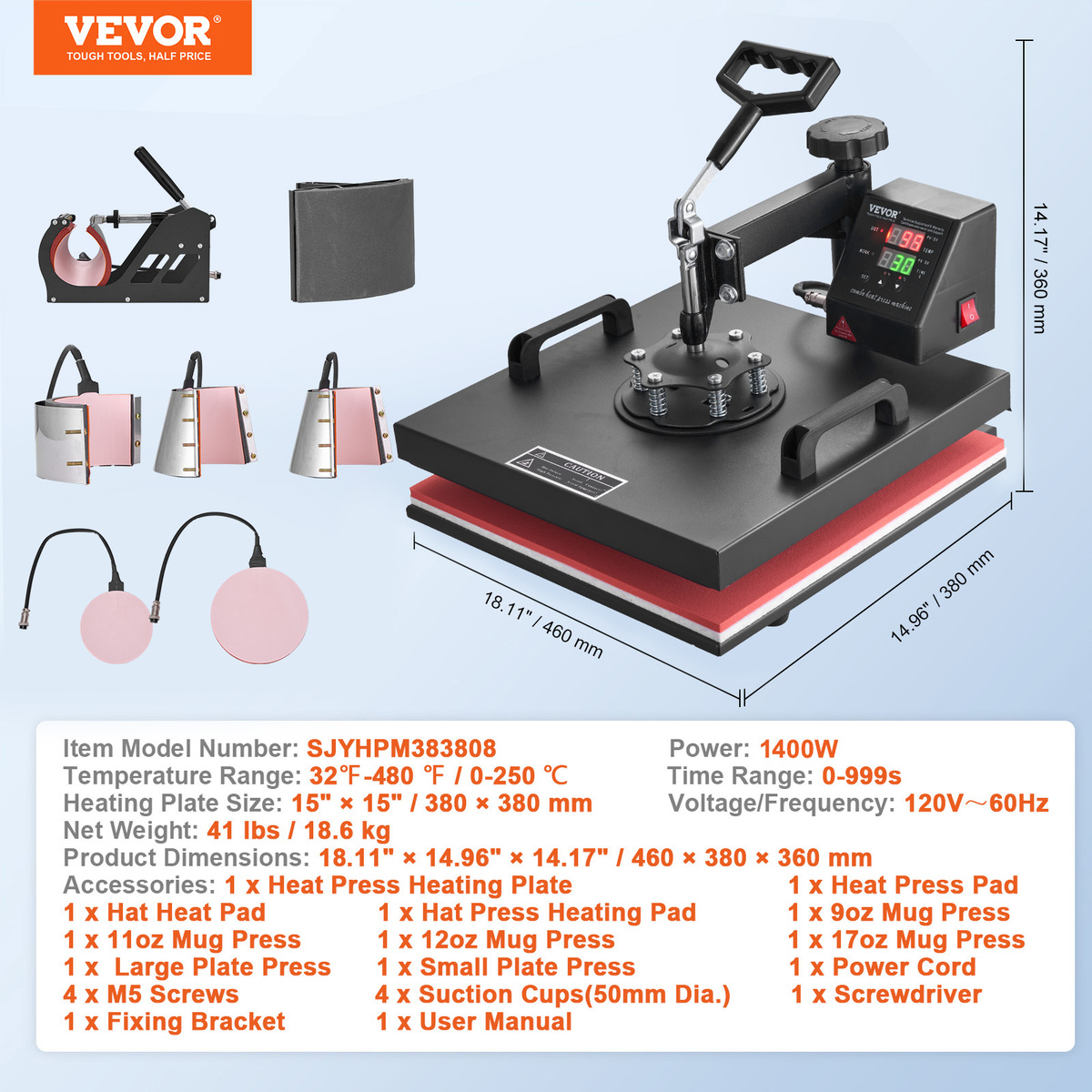 VEVOR 8 in 1 Professional Heat Press, 360° Swing Away, 15 x 15 in, 110V, Black
