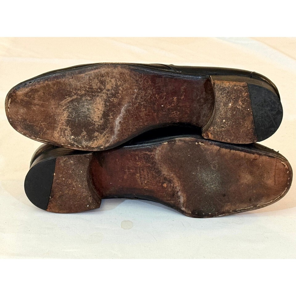 Rare European production run known for its hand-finished leather craftsmanship. Soft full-grain black leather uppers with stitched leather soles and stacked leather heels. Clean, structured silhouette with a subtle squared moc-toe ? pure minimalist Cardin style.
