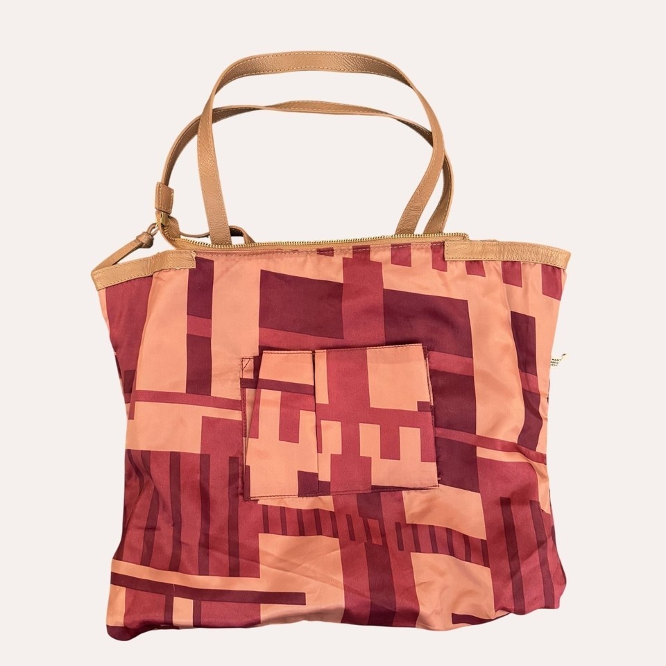 This Kooba Everette tote is crafted in soft taupe pebbled leather with gold-tone hardware and expandable zip gussets on both sides. Features a spacious interior with a zip pocket, slip compartments, and a bold burgundy geometric lining. Designed with a front pocket, tassel accents, and protective gold feet on the bottom.