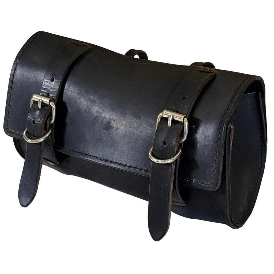 Sturdy vintage tool bag crafted from thick full-grain leather, about ?" hide. Cylindrical roll-style design with dual buckle straps and reinforced loops for attachment to a bicycle or motorcycle saddle, handlebars, or frame. Stiff yet pliable and built to last ? a timeless utilitarian piece that only gets better with age.