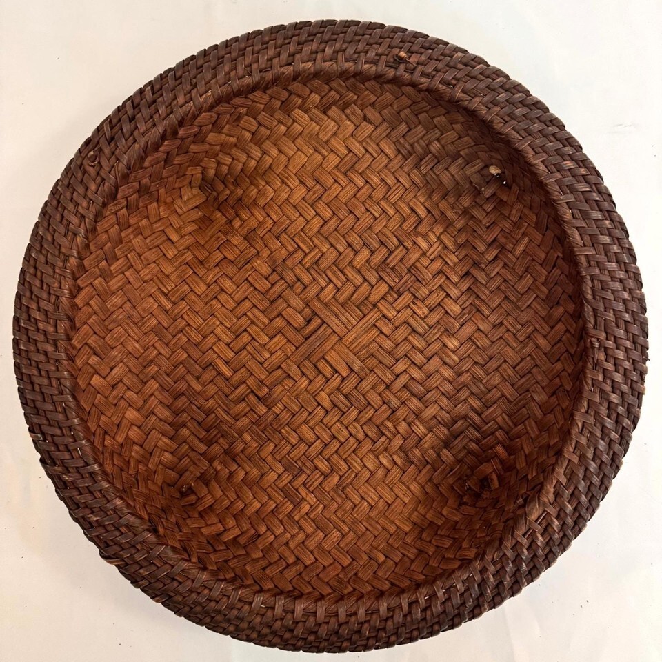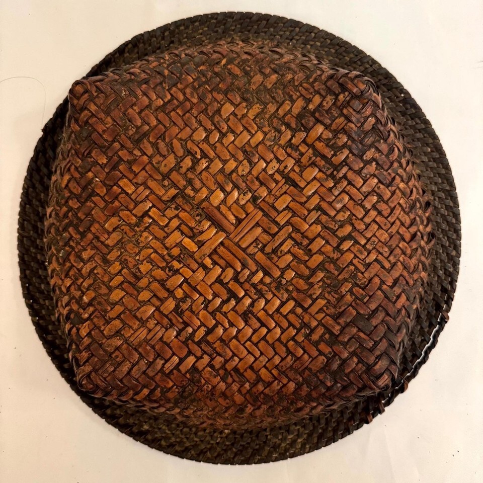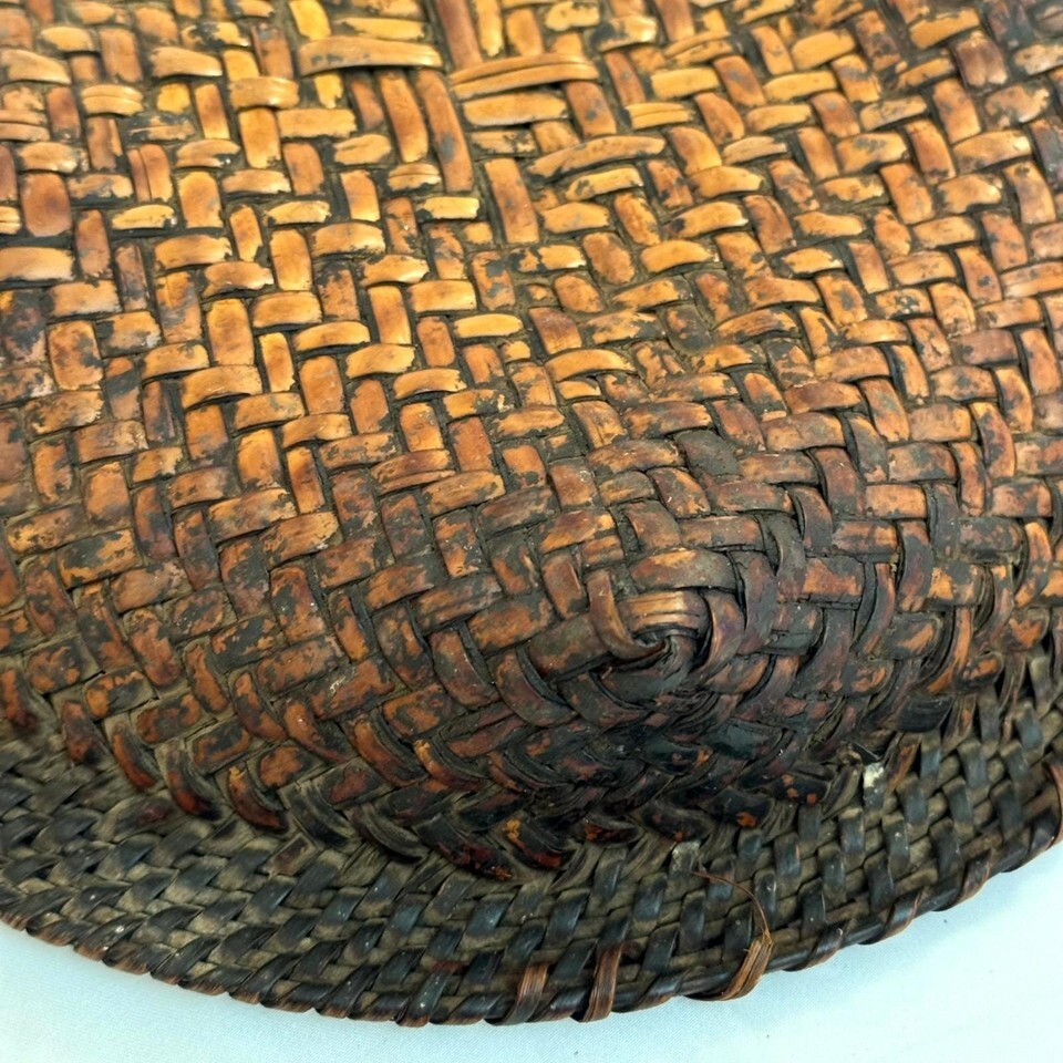 The top shows a clean, symmetrical convergence of the weave and a beautifully aged reddish-brown patina, likely from decades of use and smoke exposure. Believed to date from the early to mid-20th century based on construction style and material aging. Structurally solid yet slightly flexible, showing only one small spot of loosened weave at the lid's edge ? the only visible wear. Lid fits snugly and basket holds its shape with ease.