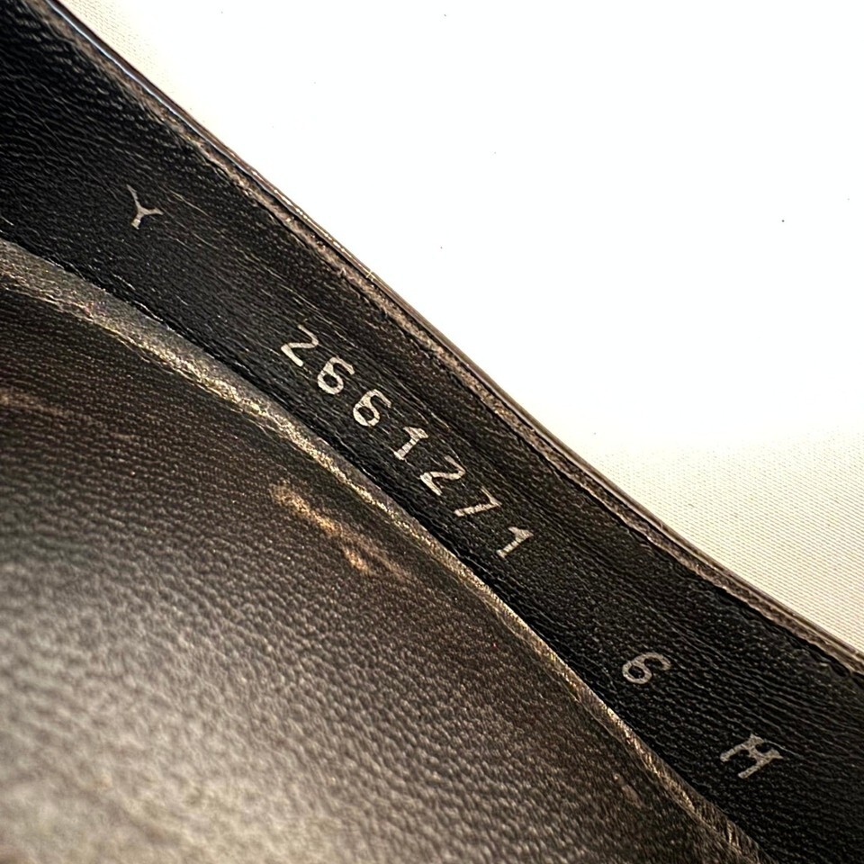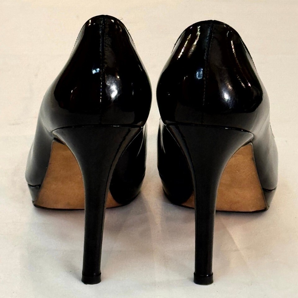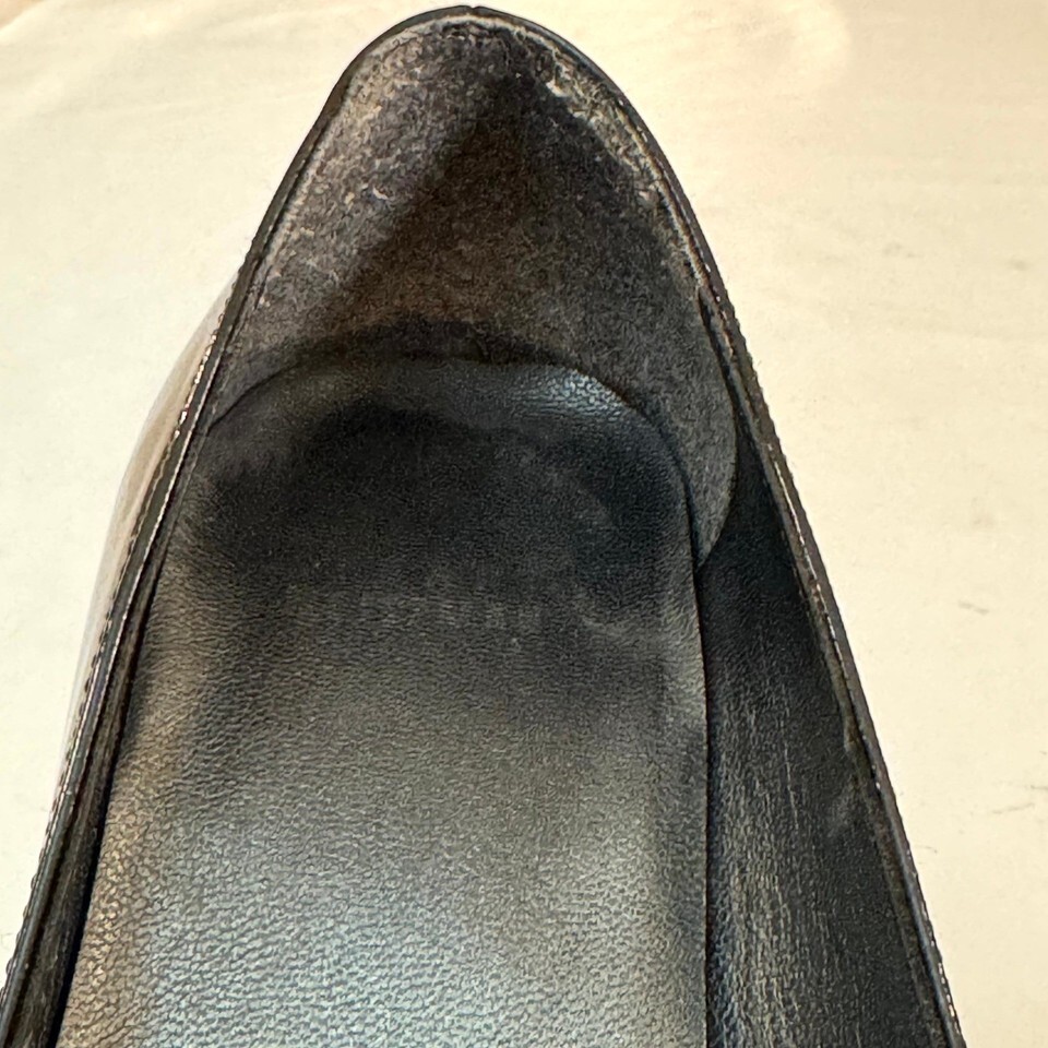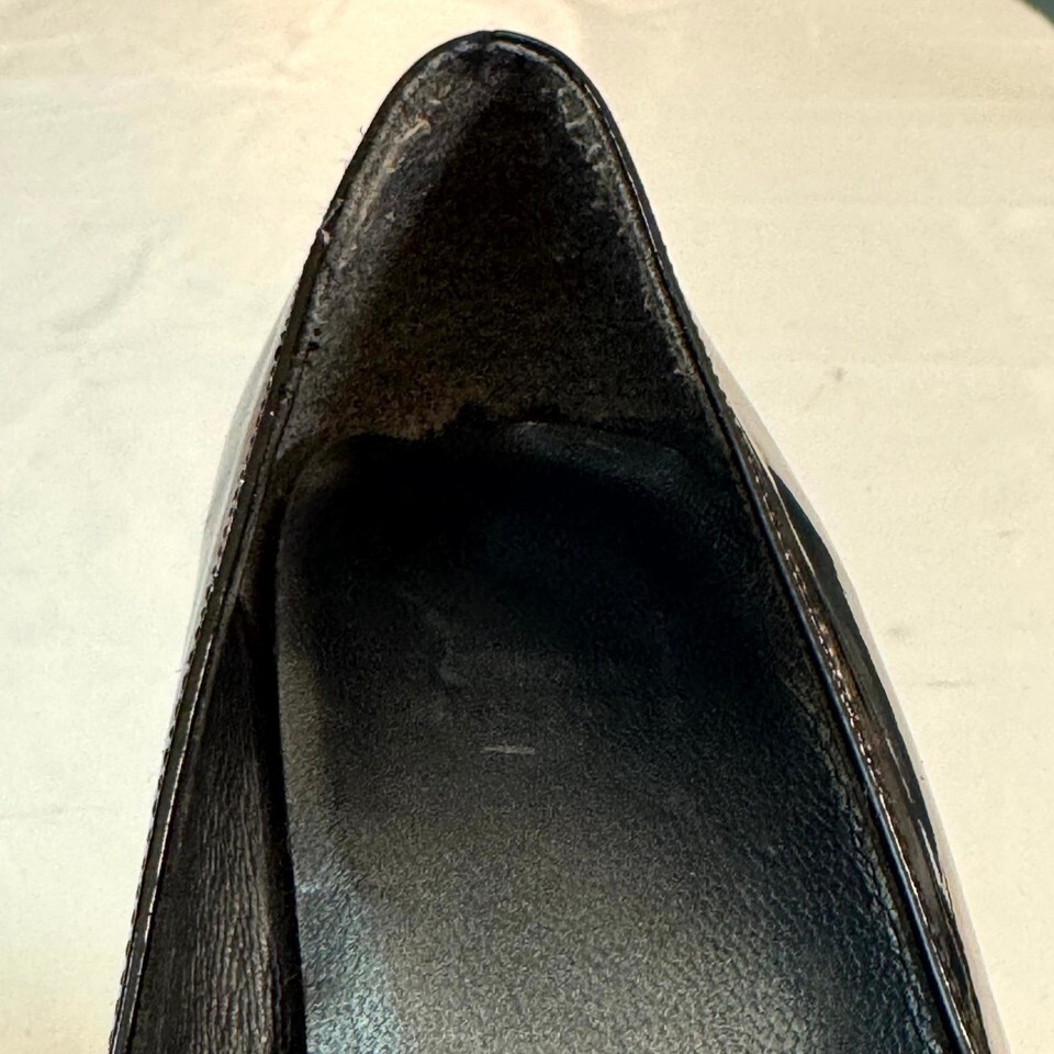 Condition: Very good pre-owned ? exterior still glossy enough to see your reflection, soles clean with light use. The only notable wear is a small insole patch at the ball of the left shoe (see photo).