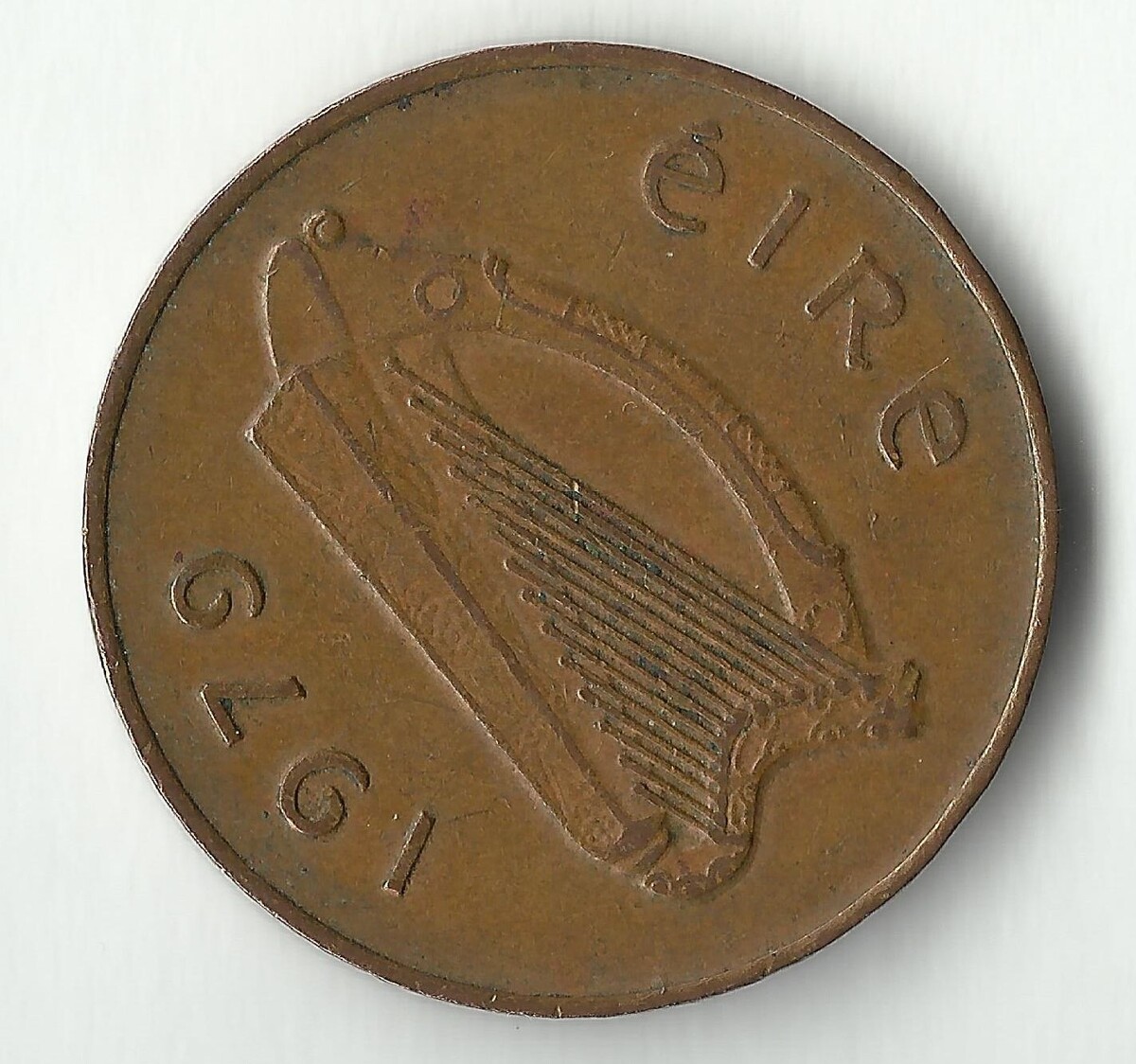 (1) 1979 IRISH 2 PENCE BRONZE COIN. THIS 1979 EIRE 2P COIN IS A BRONZE IRISH TWO PENCE COIN THAT WAS PART OF THE THIRD SMALLEST DENOMINATION OF THE IRISH POUND, WORTH 1/50 OF A POUND AND FIRST ISSUED IN 1971. FEATURES A STYLIZED ORNAMENTAL BIRD DESIGNED BY GABRIEL HAYES ON THE REVERSE AND THE IRISH HARP ON THE OBVERSE. THIS COIN WAS PRODUCED AT THE ROYAL IRISH MINT IN DUBLIN AND HAS A PLAIN EDGE. YOU WILL RECEIVE ONE (1) 1979 2 PENCE IRISH COIN, AS PICTURED, SHIPPED BY USPS....