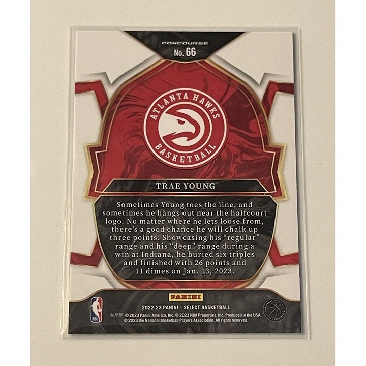 This 2022-23 Panini Select basketball trading card features Atlanta Hawks player Trae Young, card number 66, from the Blue (Retail Base) insert set. The card is made of aluminum and card stock with a thickness of 35 Pt. It is an original, not a licensed reprint, and in near mint or better condition.