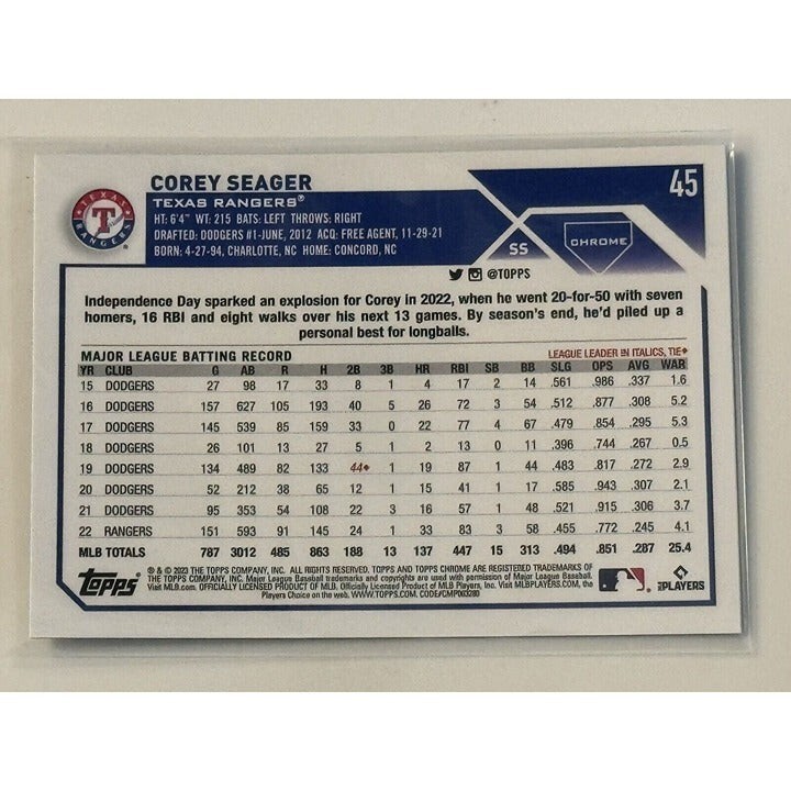 2023 Topps Chrome Logofractor Corey Seager Blue Refractor - MLB Rangers Card #45