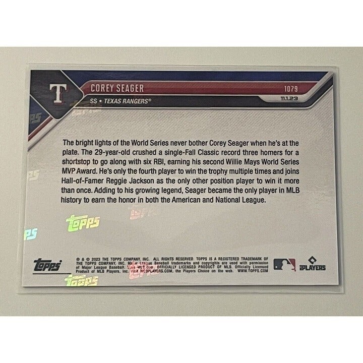 2023 MLB Topps Now COREY SEAGER Wins 2nd World Series MVP 1079 WS Texas Rangers*