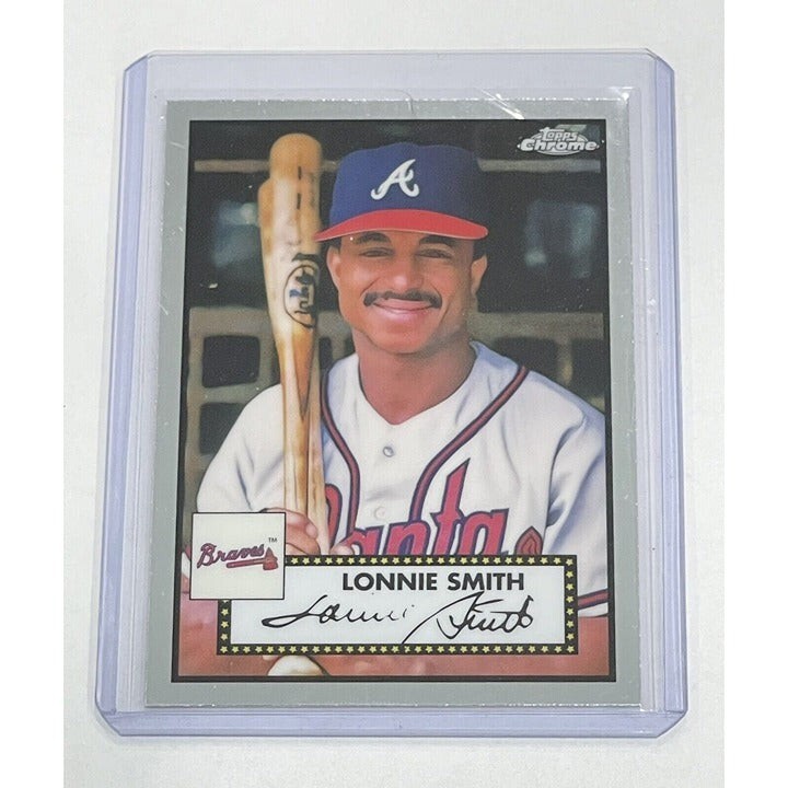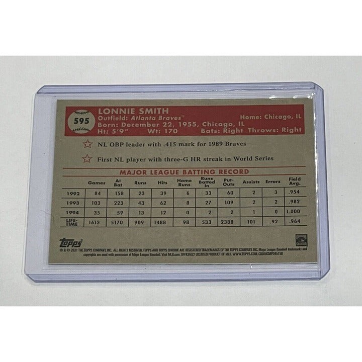This 2021 Topps Chrome Platinum Anniversary trading card features Lonnie Smith of the MLB's Atlanta Braves, card number #595. The card is made of high-quality aluminum and card stock, and has a thickness of 35 Pt. It is an original, licensed reprint and part of the base set.