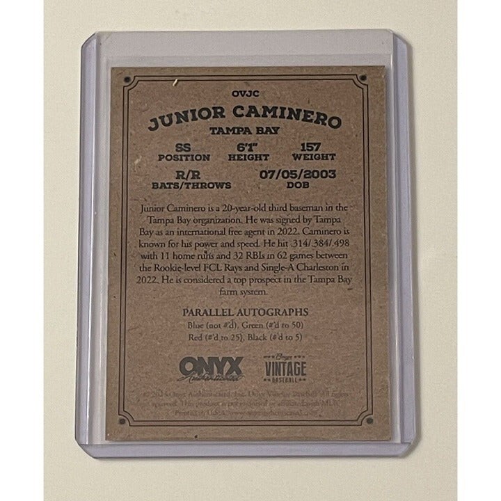 This 2023 Onyx Vintage Extended baseball card features Junior Caminero of the MLB Tampa Bay Rays. The card is made of 20 pt. card stock and paper, and is an original, non-graded, non-autographed rookie card. It has a blue ink RC and is part of the Onyx parallel/variety. The card name is "Rookie" and its number is OVJC. It was manufactured by Onyx Authenticated in the United States in 2023.