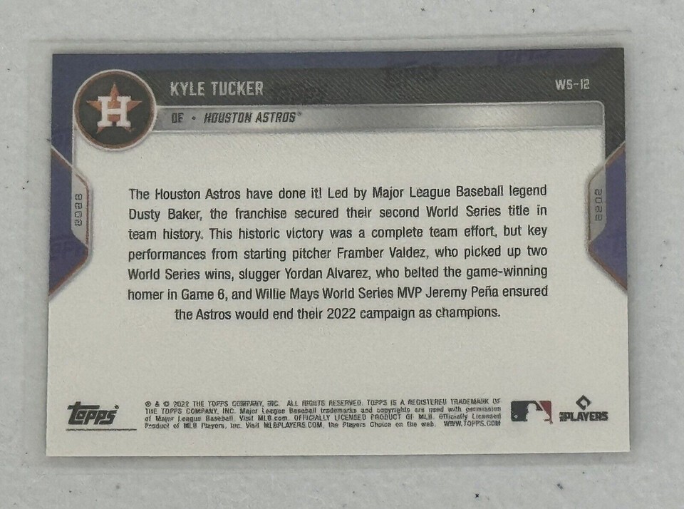 Own a piece of history with this 2022 Topps Now sports trading card featuring Kyle Tucker from the Houston Astros. This card is part of the World Series Champions Set and has the card number WS-12. It is a single card from the set and is an original, not a reprint.