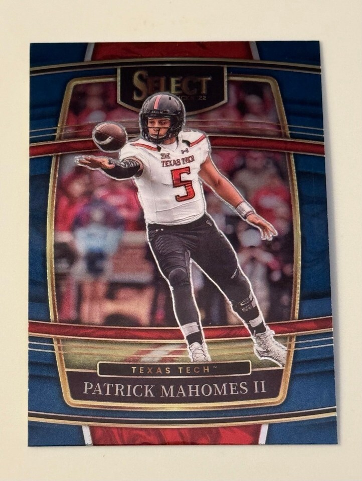 The card showcases Patrick Mahomes II, a popular player from the National Football League (NFL) and member of the Texas Tech Red Raiders. This sports trading card is an English-language original, manufactured in the United States by Panini. This card is part of the 2022 Panini Select Draft Picks set and is perfect for any collector or fan looking to add to their collection.
