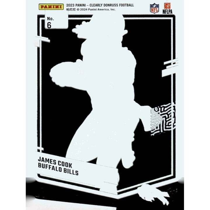 This is a 2023 Panini Donruss Clear Series football card featuring James Cook of the Buffalo Bills. The card number is 6 and it is a single trading card. It is part of the NFL AFC set and manufactured by Panini. The card is not autographed or graded. It is a great addition to any football card collection.