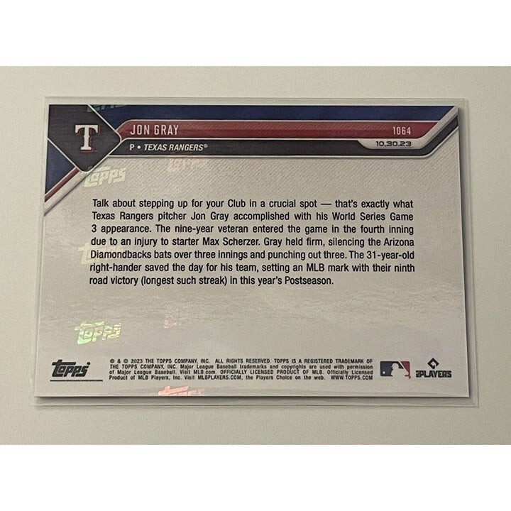 Jon Gray 20/49* Pitches In Relief 2023 MLB TOPPS NOW MLB Rangers WS - Card #1064