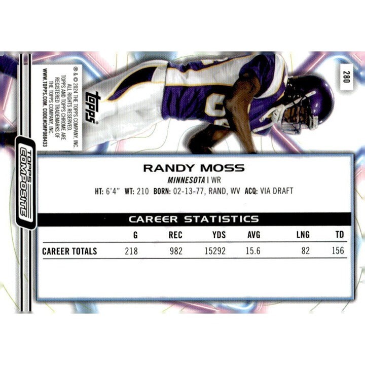 This 2023 Topps Composite NFL Football card features Randy Moss, a former Minnesota Vikings player and Hall of Fame inductee. The card is part of the 2023 Topps Composite set and has a card number of 280. It is a sports trading card that is perfect for any NFL fan or collector.