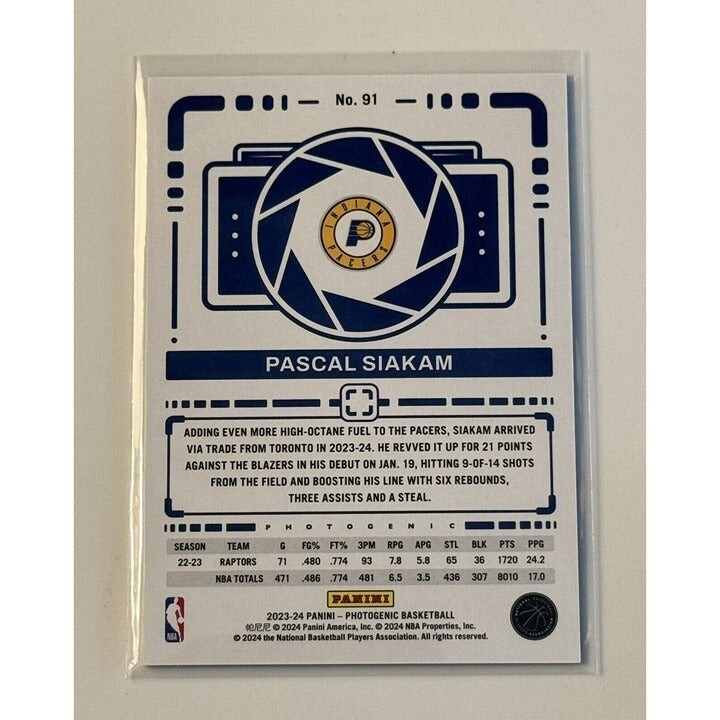 This 2023-24 Panini basketball card features Pascal Siakam, player for the National Basketball Association (NBA) team, the Indiana Pacers. The card is made of aluminum and card stock, with a thickness of 55 Pt. It is an original printing with a limited print run, and bears the card name "Photogenic" and the card number 91. The card is in standard size and is written in English.