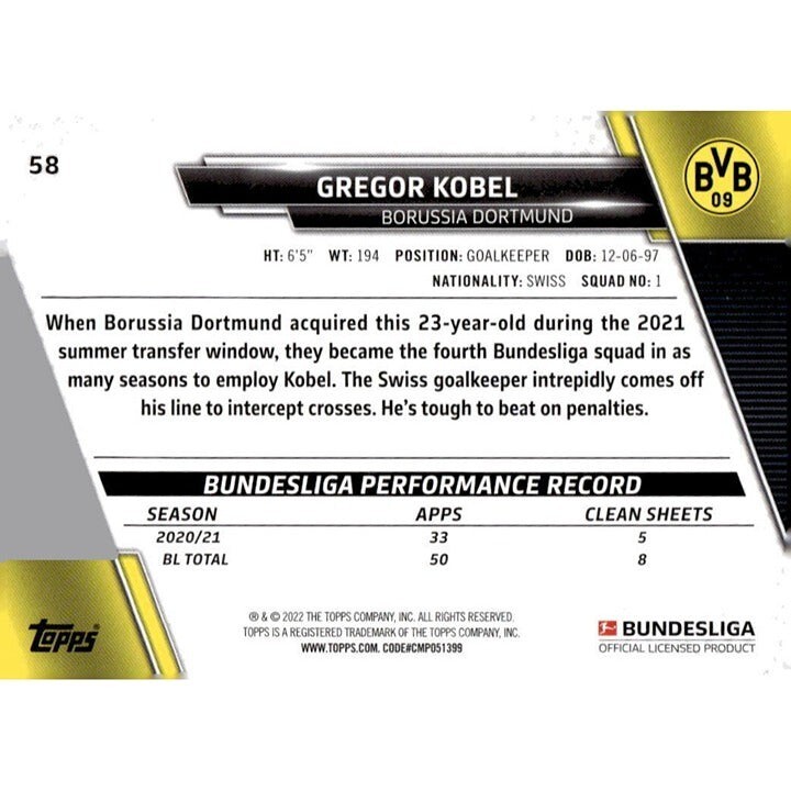 2021-22 Topps Bundesliga Soccer #58 Gregor Kobel - Borussia Dortmund Futbol Card