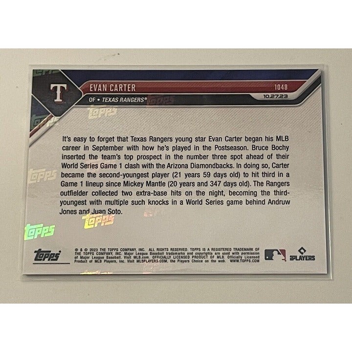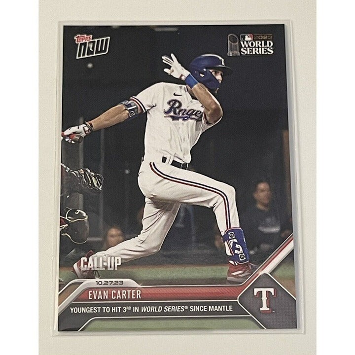 Get your hands on this exclusive Evan Carter Call Up MLB Texas Rangers 2023 MLB TOPPS NOW Card 1048 with a print run of 1677. This Topps original sports trading card is made of 35 Pt. card stock and features the base set of the Major League (MLB) event/tournament - MLB World Series. The card is in standard size, measures 2.5" x 3.5" and comes in English language.