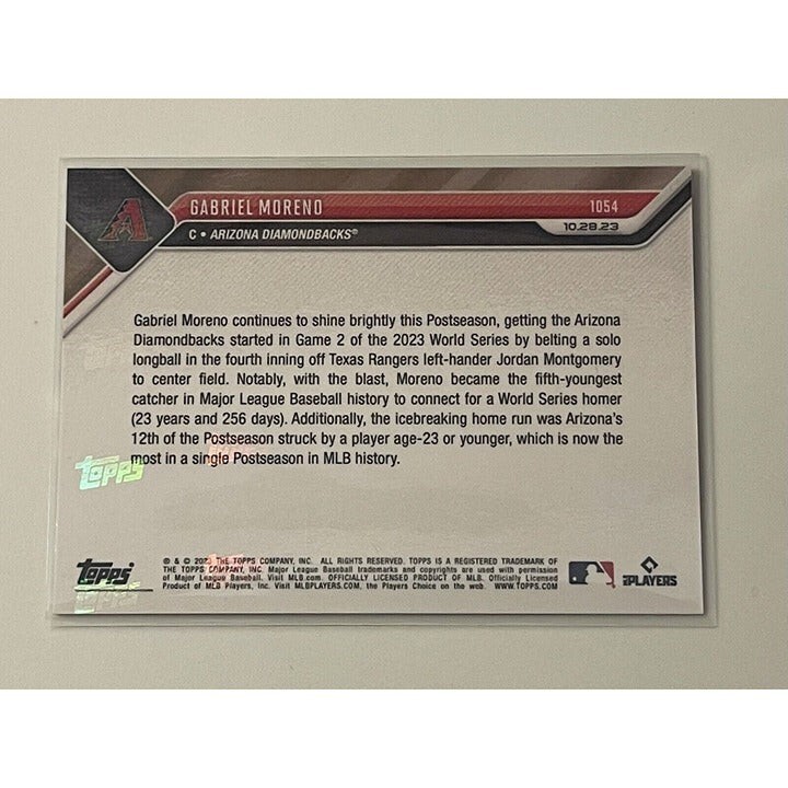 This Not Numbered 2023 Topps NOW Gabriel Moreno baseball card features the player's 4th inning home run during the MLB World Series. The card is part of the 2023 Topps NOW set and is numbered as card #1054. It is a standard size trading card made of aluminum and card stock with a thickness of 35 pt.