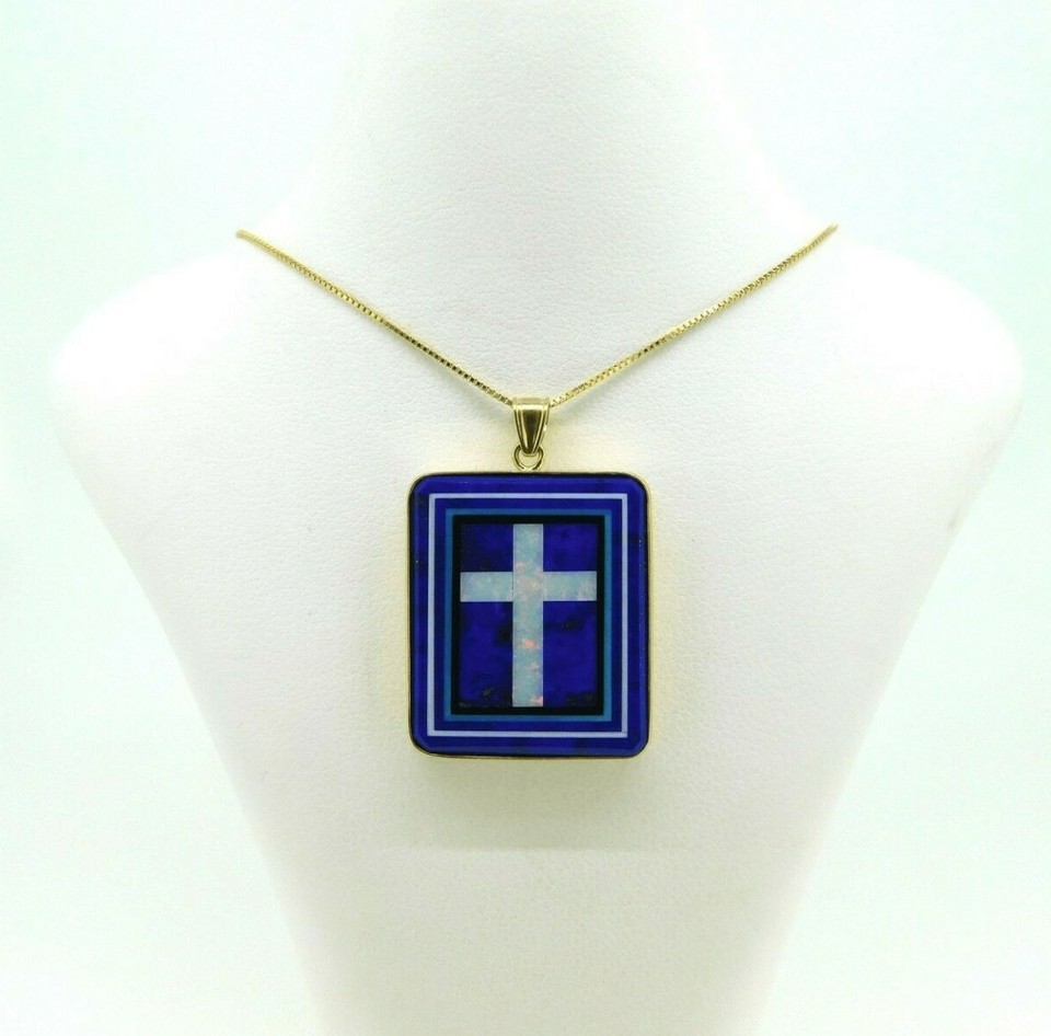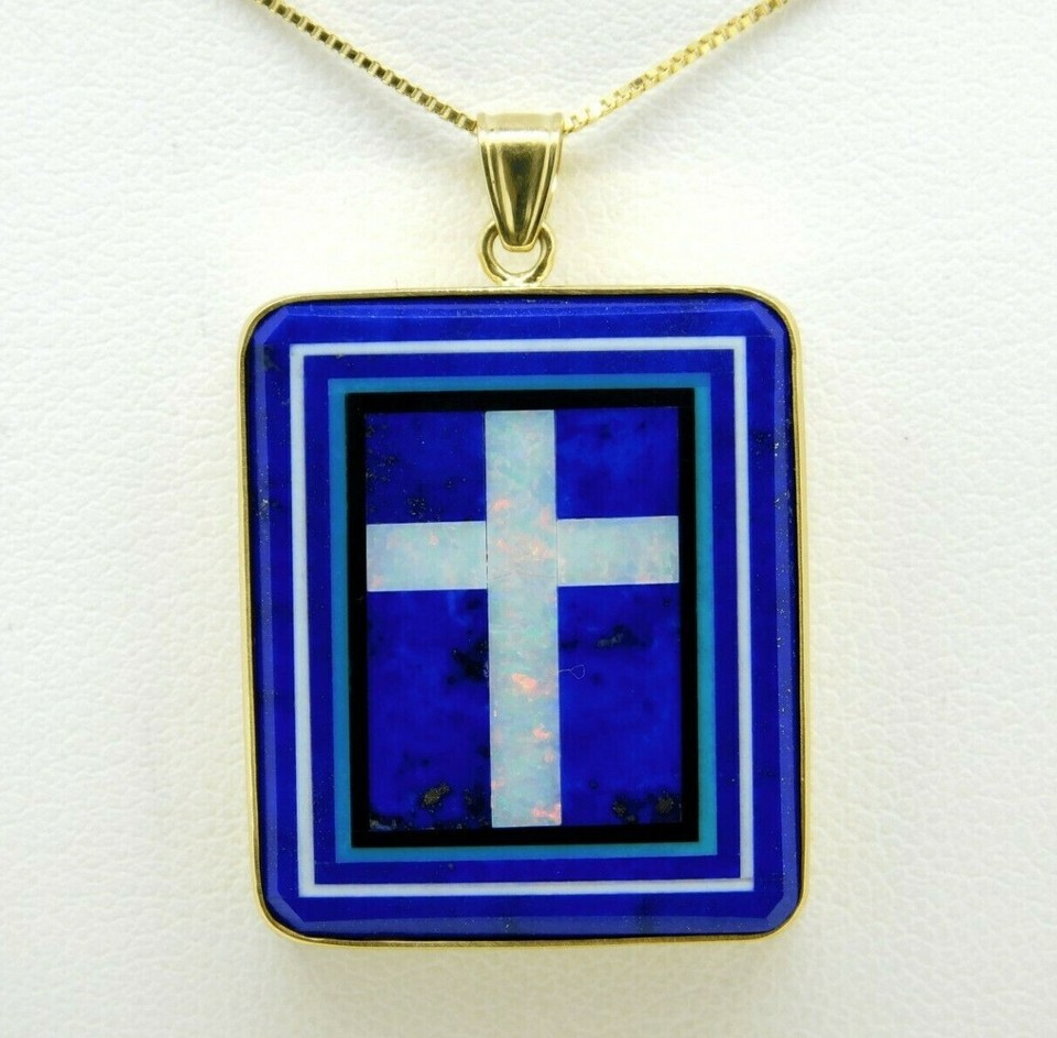14k yellow gold intarsia pendant made with an opal cross in the center. The inlay was made with opal, lapis, turquoise, and black and white agate. The intarsia was made and signed by Jim Kaufmann and has a custom 14k bezel.