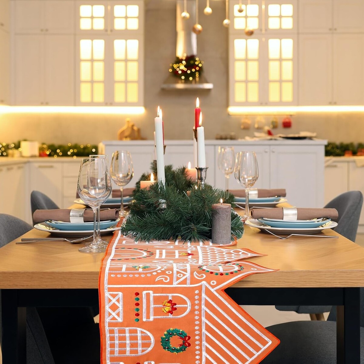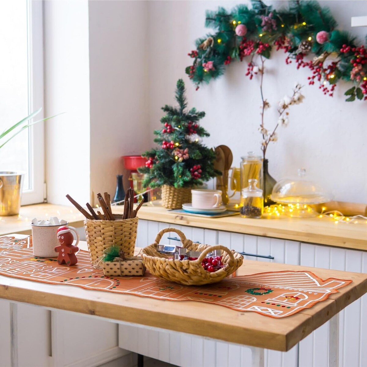 our Christmas gingerbread table runner is based on the outline of a gingerbread village and features delicate embroidery; Its khaki base elegantly complements green wreaths, bells, and holly, capturing the festive spirit; Elevate your holiday decor and add a warm, inviting glow to your festivities