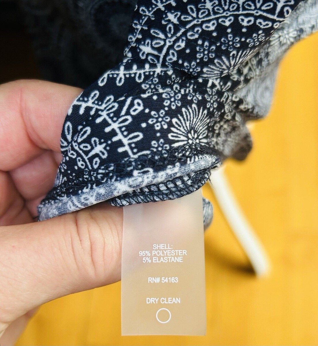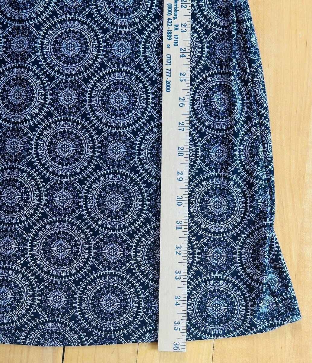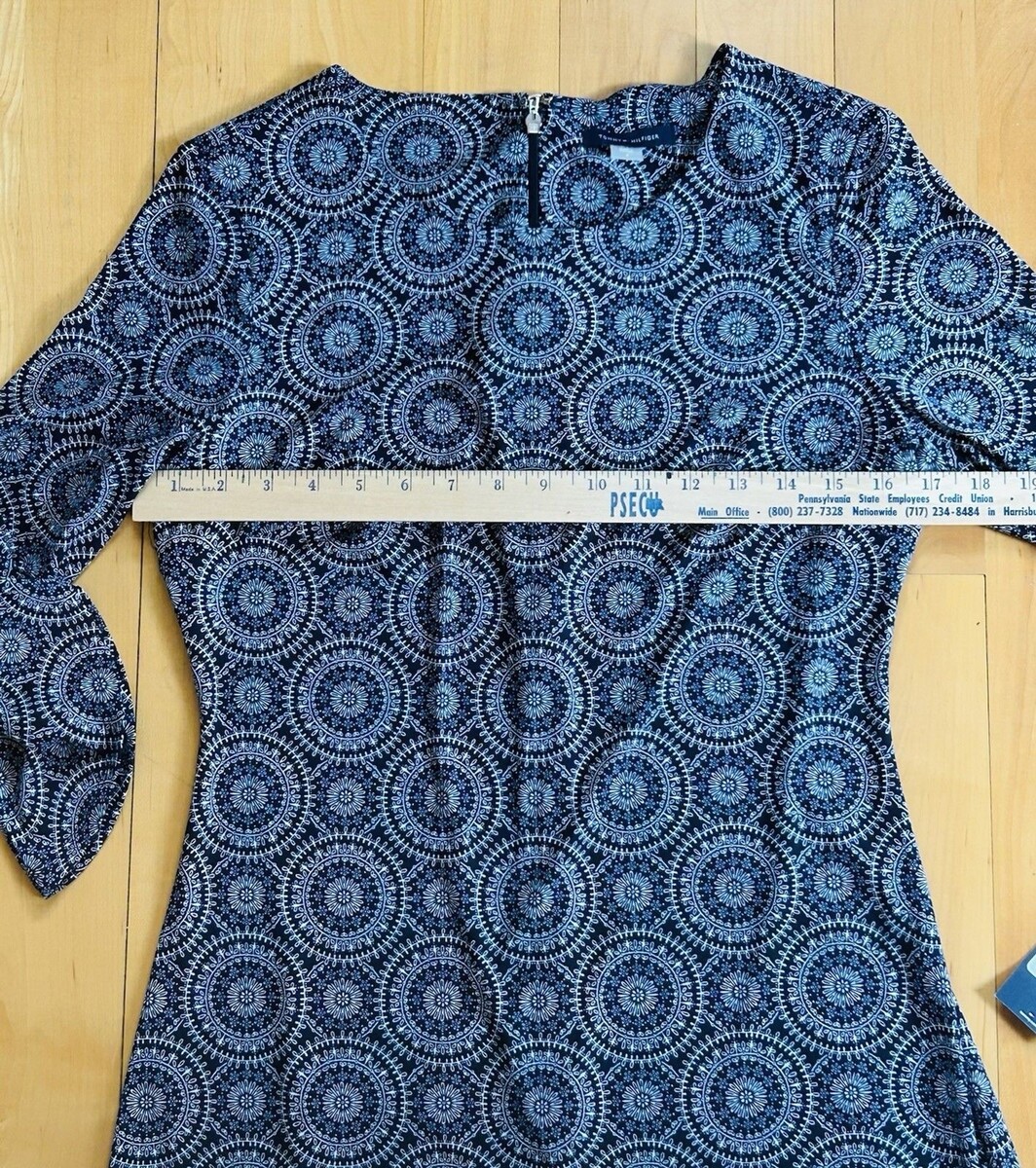 This Tommy Hilfiger dress in size 4 features a flattering fit and flare style with a knee-length hem and 3/4 bell sleeves. The dress is designed with a round neck, pullover closure, and a vibrant floral pattern in navy blue and white. Made from a blend of polyester, spandex, and rayon, this dress is machine washable for easy care. Perfect for a stylish and comfortable outfit for any occasion.