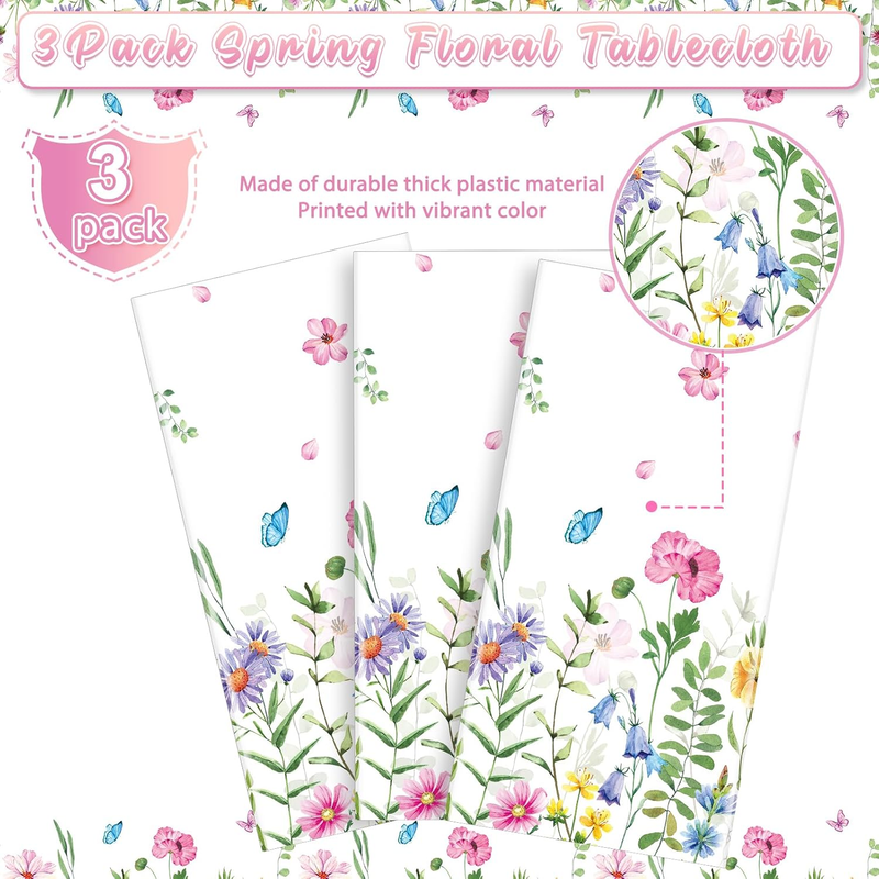 3Pcs Spring Floral Plastic Tablecloth,Pink Purple Blue Flower Butterfly Disposable Table Cover for Home Decor Summer Spring Picnic Dining Holiday Weeding Birthday Tea Party Decorations,54X108 Inch