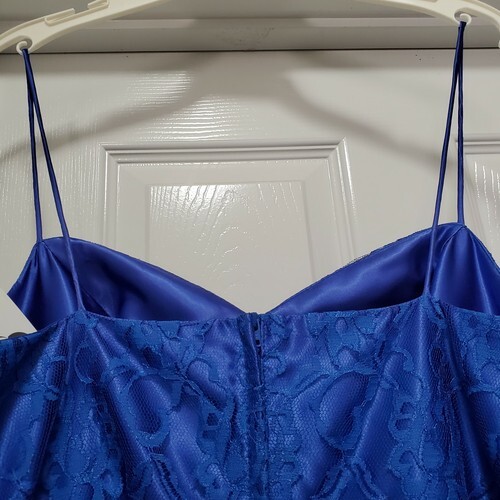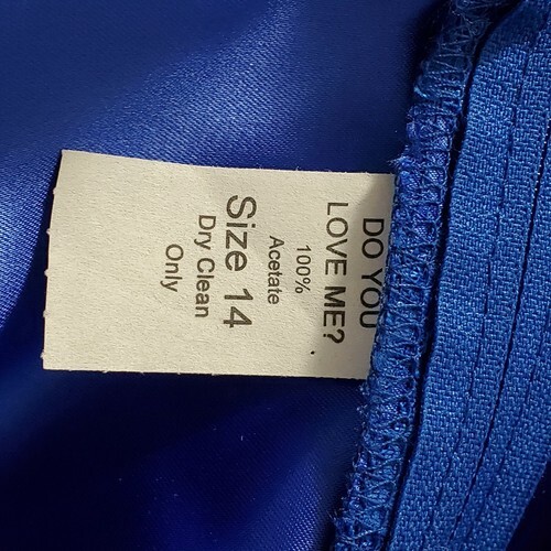New With Tags Do You Love Me? Acetate Formal Floor Length Royal Blue Dress Women's 14. Actual measurements: 39" Chest, 6.5" strap length. Ideal if you're around 5' 3" - This would make a Beautiful Bridesmaids, Prom or Formal Dress. Has gorgeous spaghetti straps, v-neck design, and a back zipper closure.