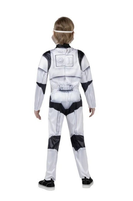 This Star Wars Stormtrooper costume for youth boys features a printed jumpsuit based on the iconic Imperial armor from Star Wars: A New Hope.