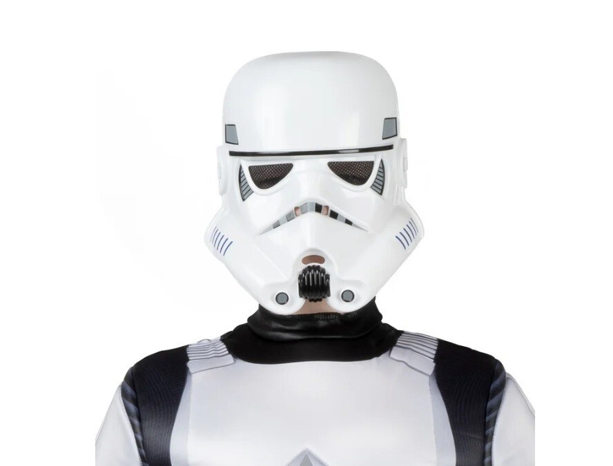 A plastic mask with an elastic strap is included to complete the authentic Stormtrooper look.