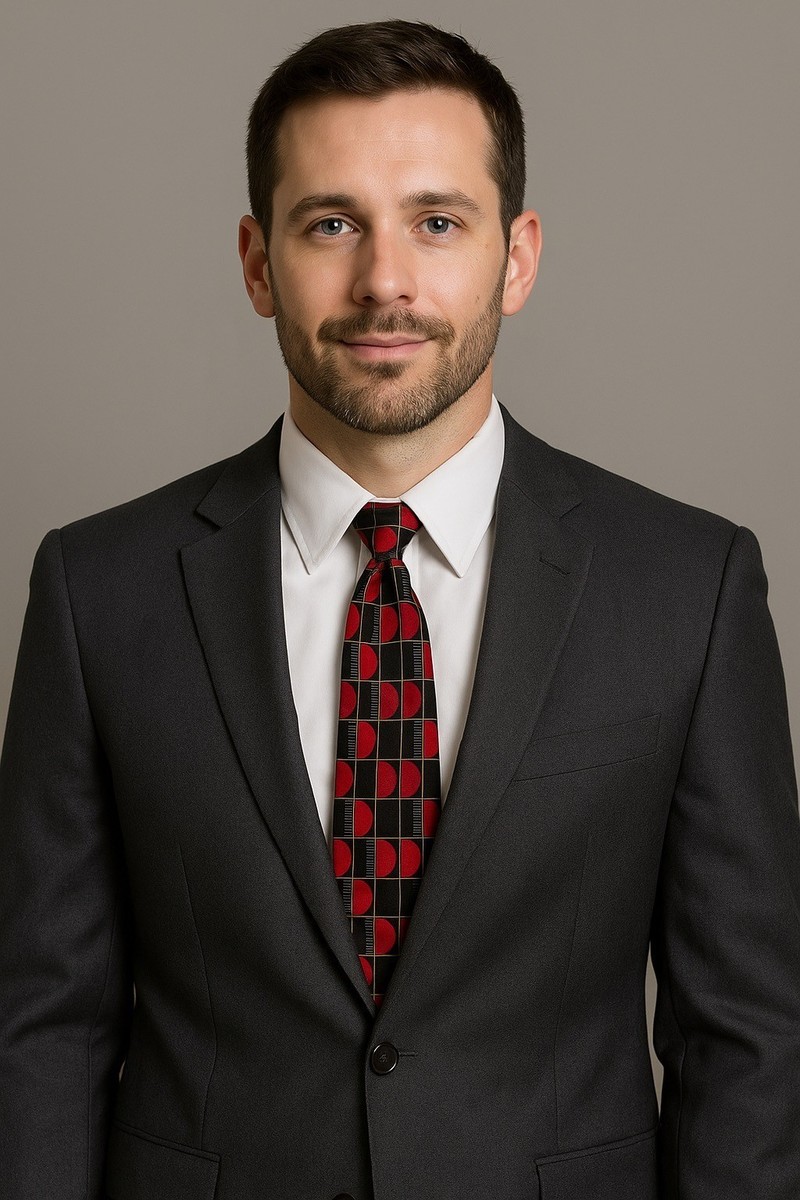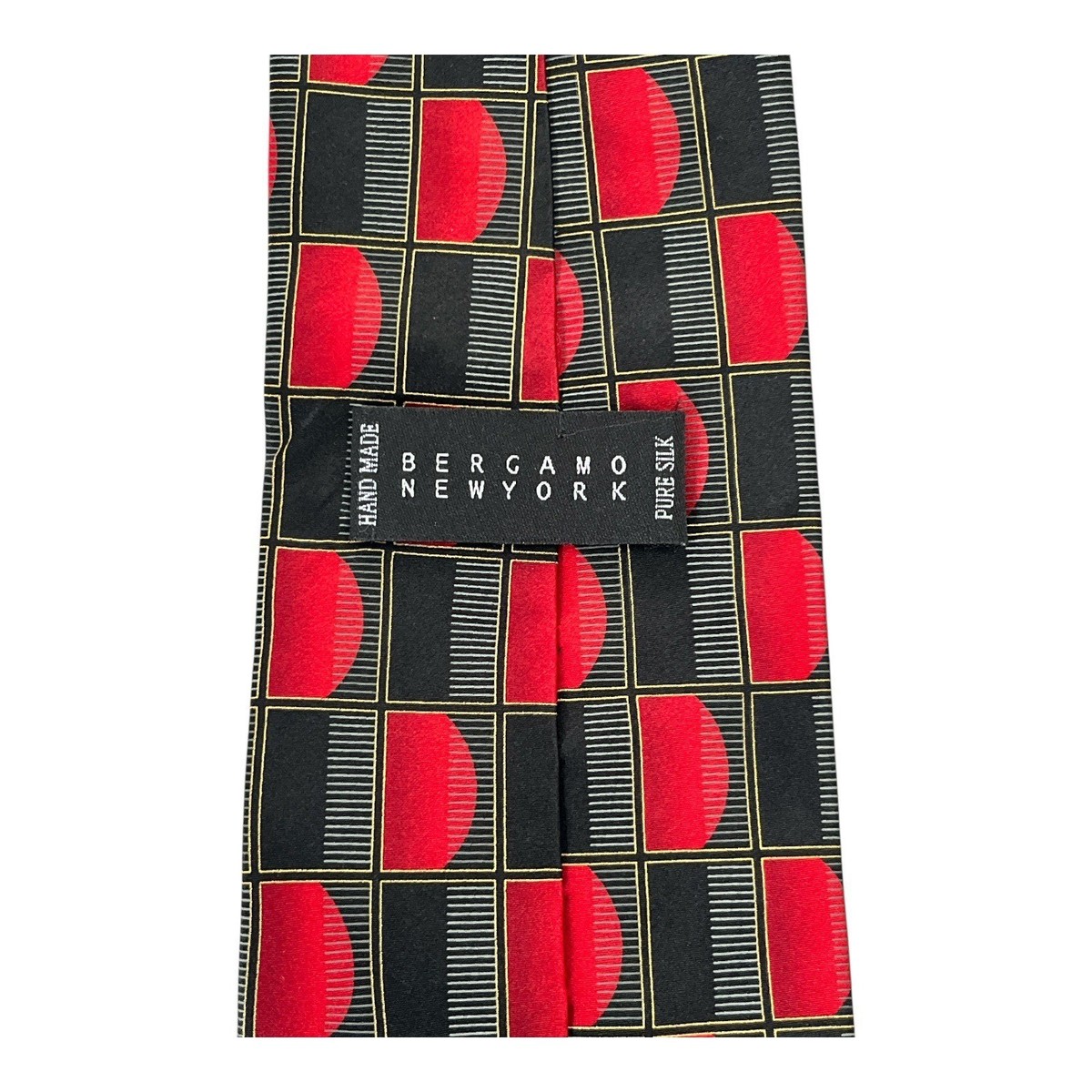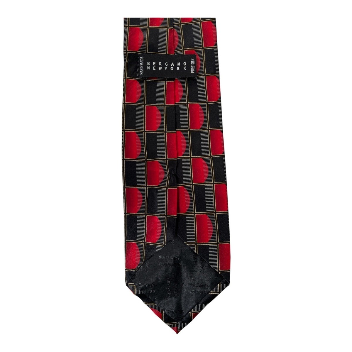 Classic Bergamo New York men?s tie featuring a bold red and black geometric pattern with fine gold and gray detailing. Made of pure silk and hand crafted with quality stitching, this is a striking statement accessory ideal for business, formal wear, or collecting.