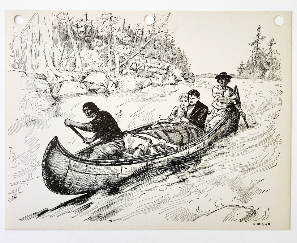1930s-40s Art Print Couple Rescued In Canoe By Native Americans E89D