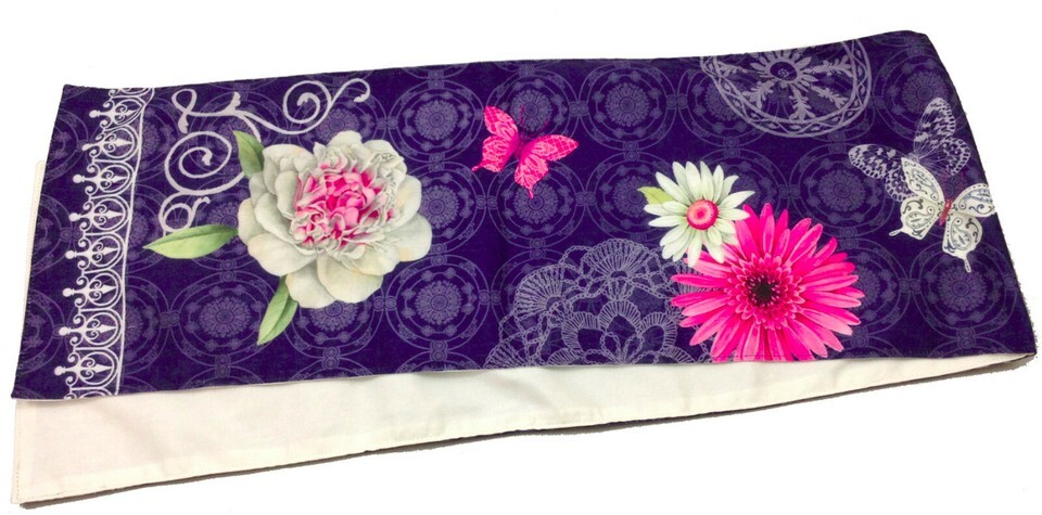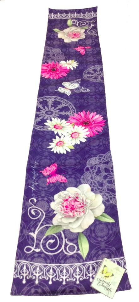 beautiful Sndy Lynam Claugh Indigo Blue Table Runner is the perfect centerpiece for your spring or summer table decor. This 72" table runner has a deep blue background with pink zinnias, white daisies with pink centers and white roses. Pink and white butterflies take flight among the flowers. Ends of the table runner have a white gate looking design and the background is a deep blue and has varying circle designs. Made in the USA. Dry or spot clean only. Made in the USA