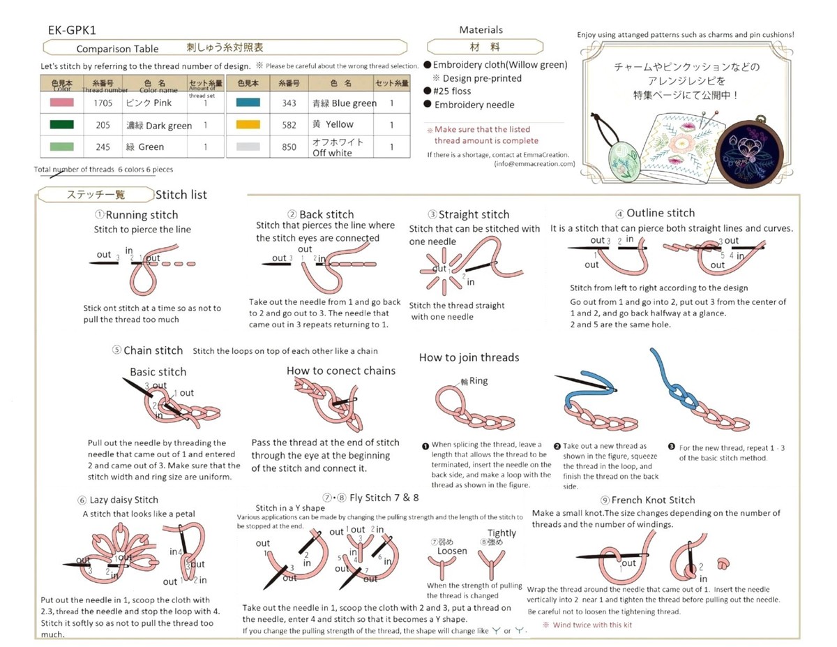 It contains 100 percent cotton embroidery cloth in 13cm x 26cm with pre-printed patterns for practice, six colors of Cotton No 25 Embroidery floss, needle and instructions.