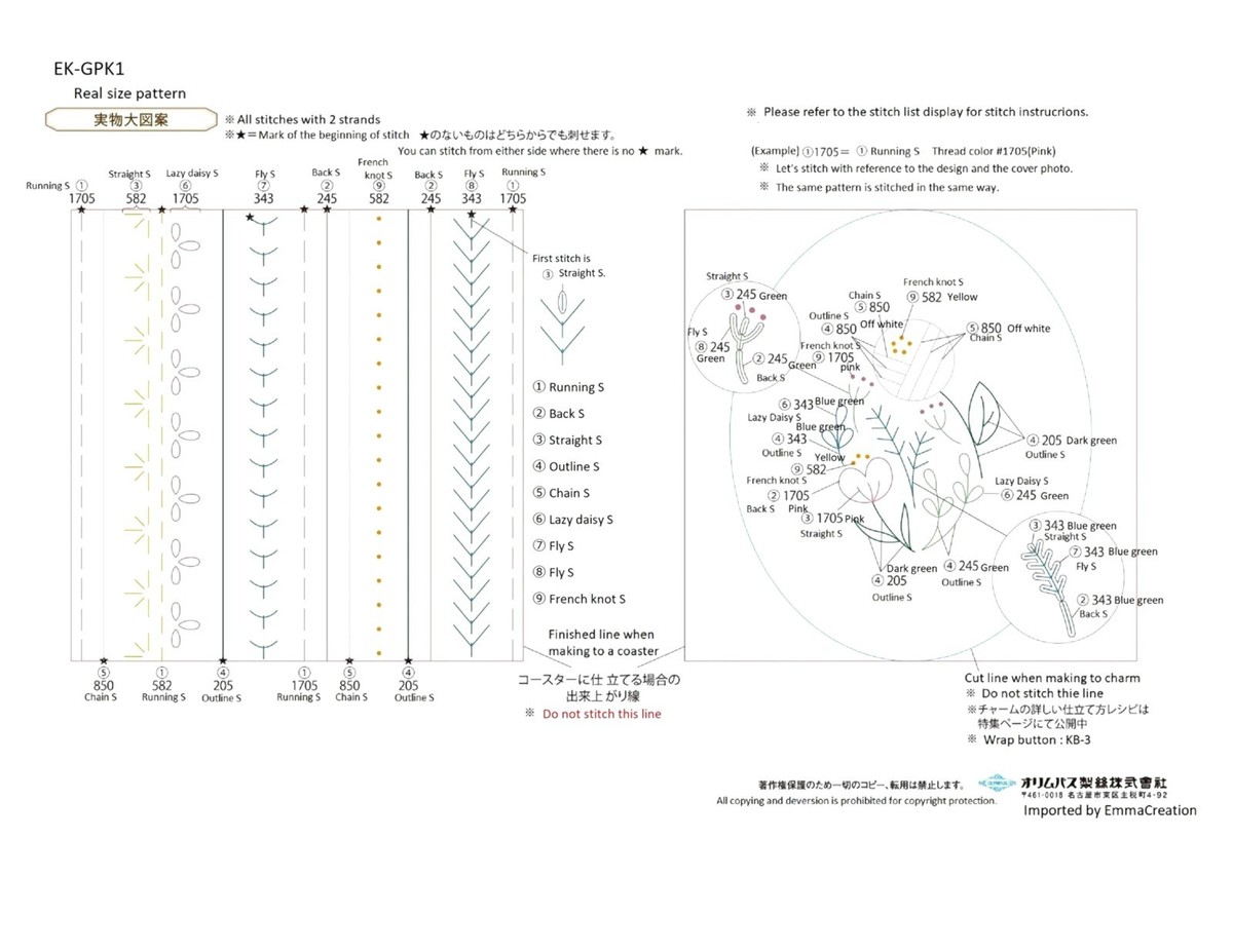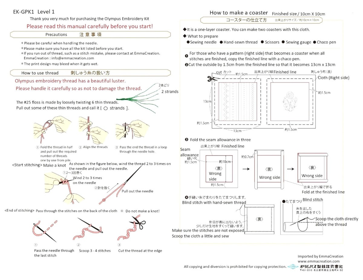 Olympus Garden Party First French Embroidery Kit Level 1 GPK-1. This embroidery stitch learning kit level one teaches you 9 basic stitches. It contains 100 percent cotton embroidery cloth in 13cm x 26cm with pre-printed patterns for practice, six colors of Cotton No 25 Embroidery floss, needle and instructions. Difficulty Level: Beginner. Estimated production time: 5 hours. Fabric Size (H x W): Approx. 5.1 x 10.2 inches (13 x 26 cm). Item Number: GPK-1. CHK-EK-GPK1