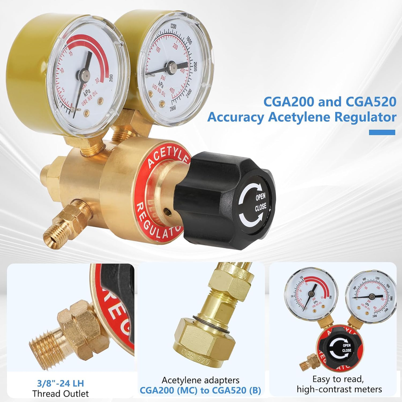 CGA200 and CGA520 Acetylene Regulator:The CGA200 Acetylene Regulator adopts a solid brass body and a standard 9/16 "-18 LH outlet hose connector.The inlet pressure is 0-400 PSI and the outlet pressure is 0-30 PSI. The CGA-200 Acetylene Regulator is only suitable for MC acetylene tanks, but the acetylene adapters CGA200 (MC) to CGA520 (B) in the kit allows for using large CGA 520 Regulator on small MC CGA-200 Portable Cylinder