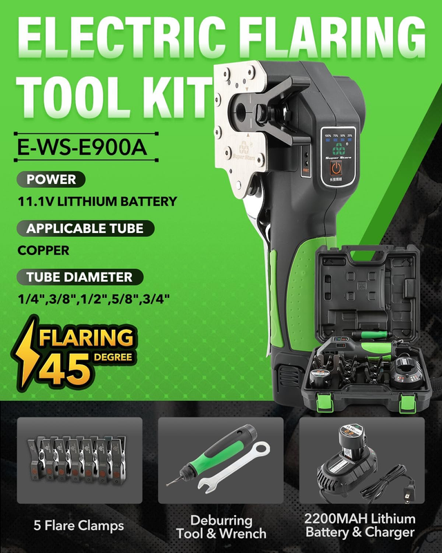 [Professional-Grade Electric Flaring]The Wisscool electric flaring tool delivers effortless, high-precision flares with its powerful rechargeable 2200 mAh battery. Perfect for HVAC, plumbing, and automotive applications, it creates consistent 45 eccentric flares in seconds?ideal for copper, aluminum, and brass tubing (1/4"?3/4"). No more hand fatigue or uneven results for normal manual labor.