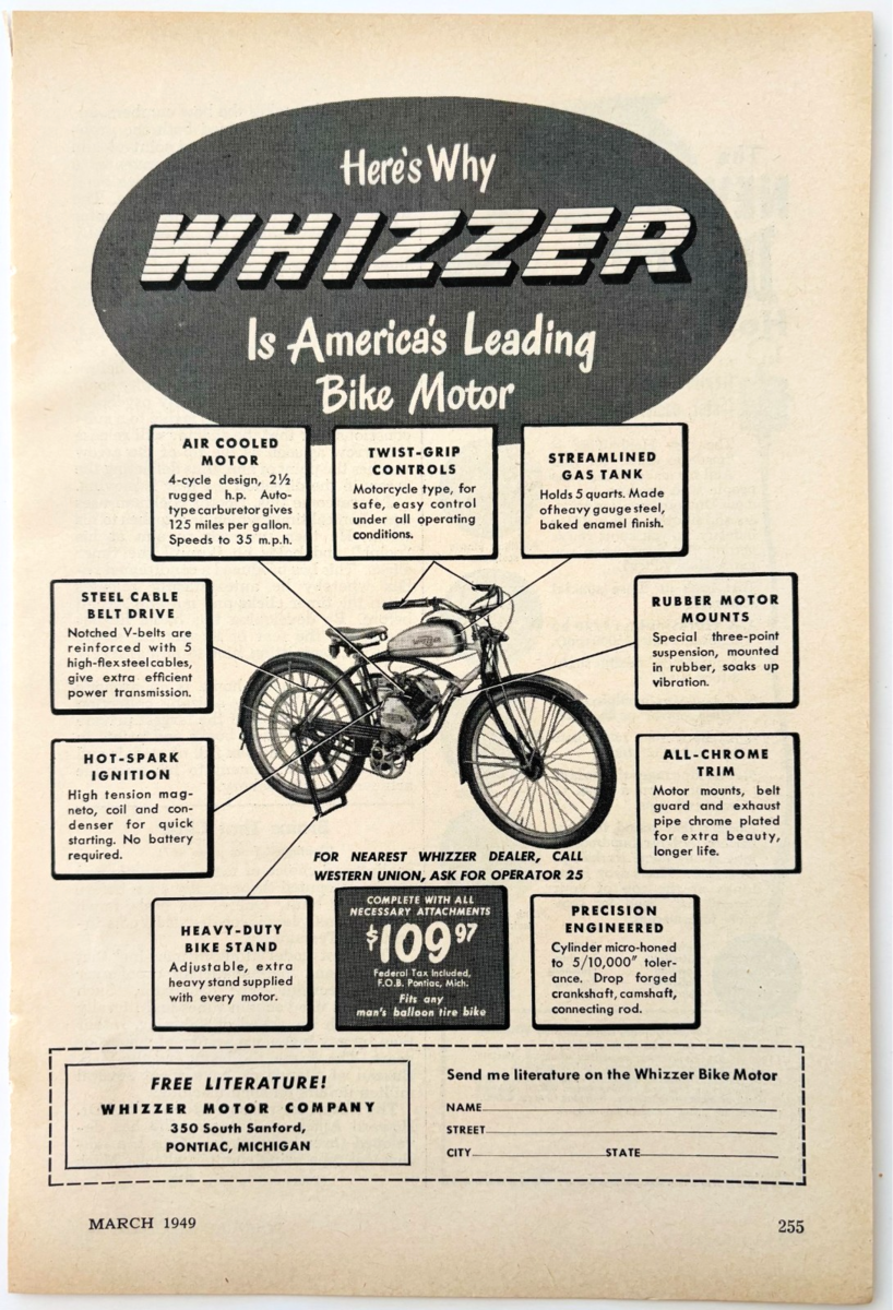 1949 Whizzer Motorcycle Advertisement Vintage Motor Bikes Transportation DWU16B