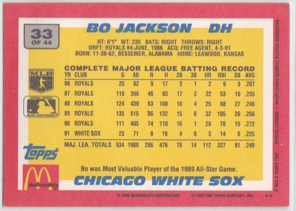 G) 1992 Topps McDonald's Baseball's Best Trading Card - Bo Jackson #33 of 44
