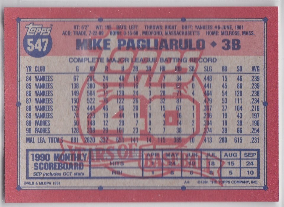 M) 1991 Topps Baseball Trading Card - Mike Pagliarulo #547