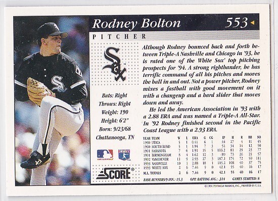 M) 1994 Score Baseball Trading Card - Rodney Bolton #553