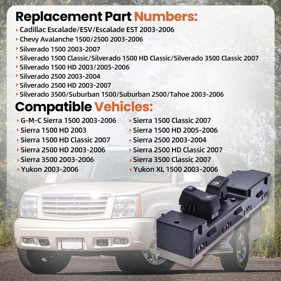 Compatible Vehicles: for Cadillac Escalade/ESV/Escalade EST 2003-2006, for Chevy Avalanche 1500/2500 2003-2006, for Silverado 1500 2003-2007, for Silverado 1500 Classic/Silverado 1500 HD Classic/Silverado 3500 Classic 2007, for Silverado 1500 HD 2003/2005-2006, for Silverado 2500 2003-2004, for Silverado 2500 HD 2003-2007, for Silverado 3500/Suburban 1500/Suburban 2500/Tahoe 2003-2006