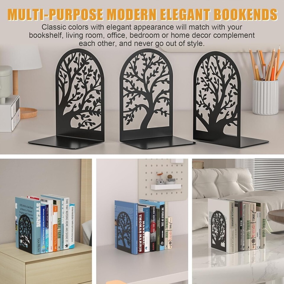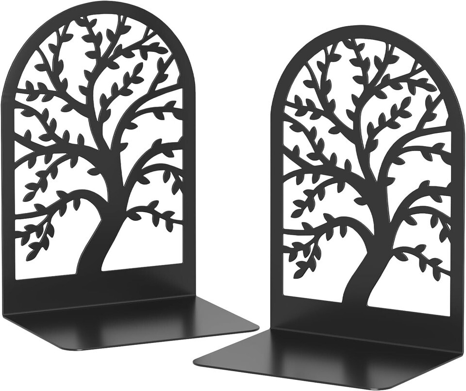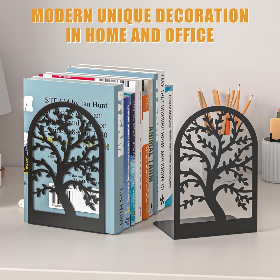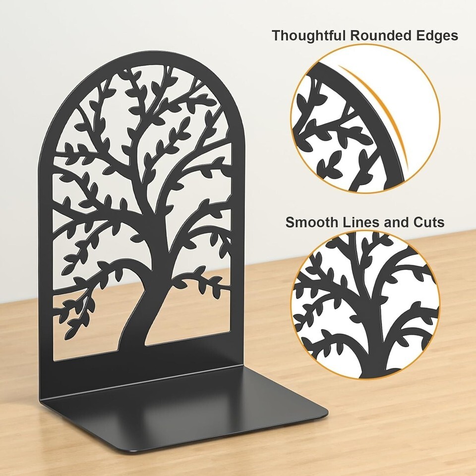 PREMIUM METAL BOOK ENDS -- These tree book ends are made of thickened quality metal, combined with plasma cutting technology, exquisite shaped, sturdy and not easy to bend, which can hold books neatly and also suitable for large books. Matte anti-static paint finish makes the metal bookends more durable.