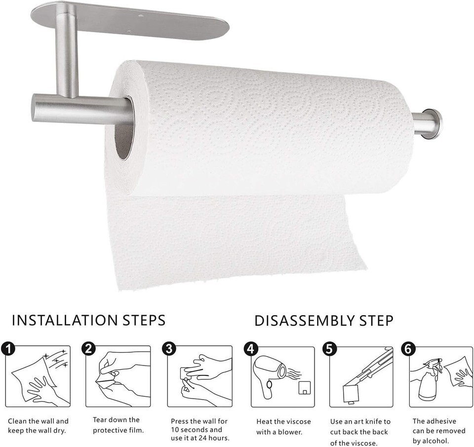 [Characteristic]: Paper towel holder under cabinet mount:Paper towel holder constructed of SUS 304 Stainless Steel,Strong and not easily deformed, Waterproof and Rustproof.It has good load-bearing and stickiness, and it is not easy to fall off