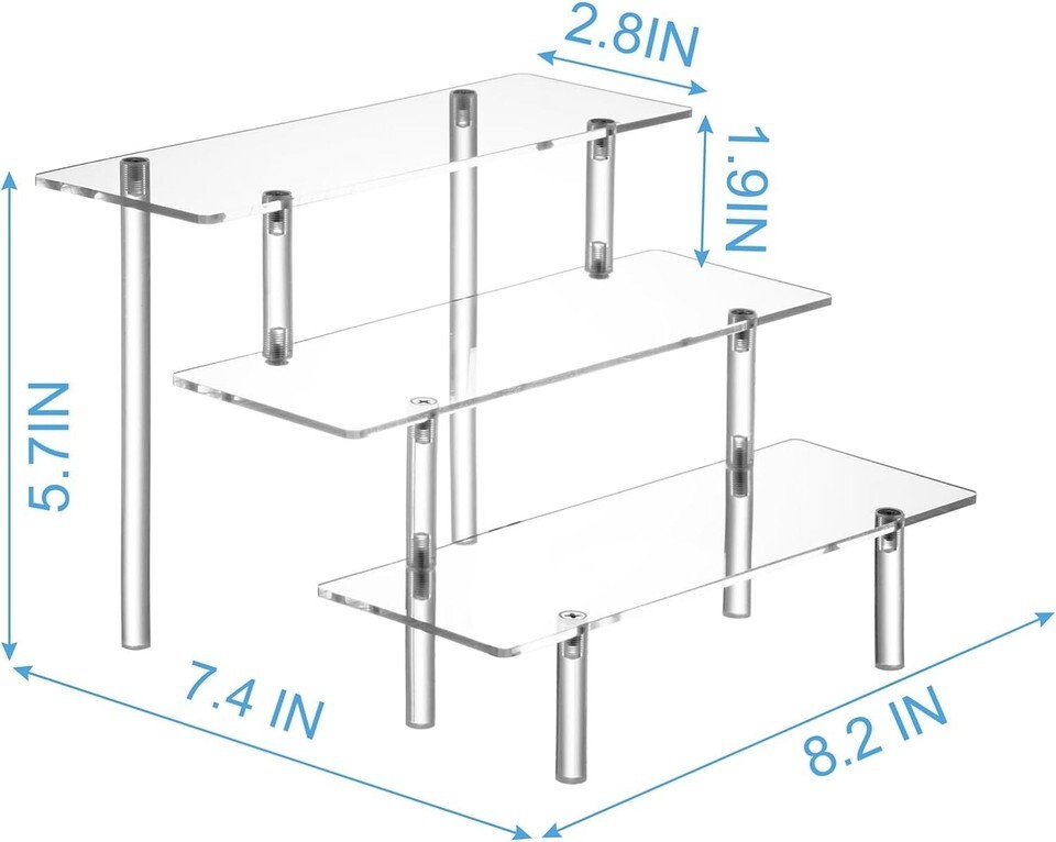 ??Display More Things? SIZE: Every acrylic panel is 8.2IN long and 2.8IN wide, the height of each tier is 1.9IN, the total height is 5.7IN. 3 tier cupcake stand is simple design and durable. Acrylic cupcake stand 3 tier features 3 layers that provides enough space to cologne perfume, cosmetic, skincare lotion, Amiibo Funko POP Figure, dessert, cupcake risers, collectibles and etc.
