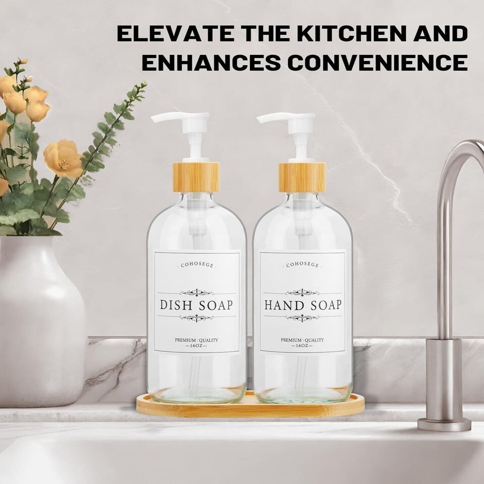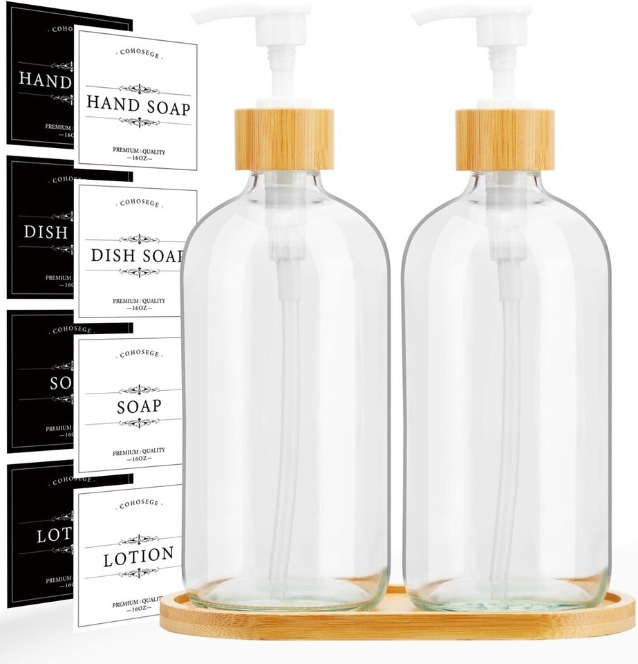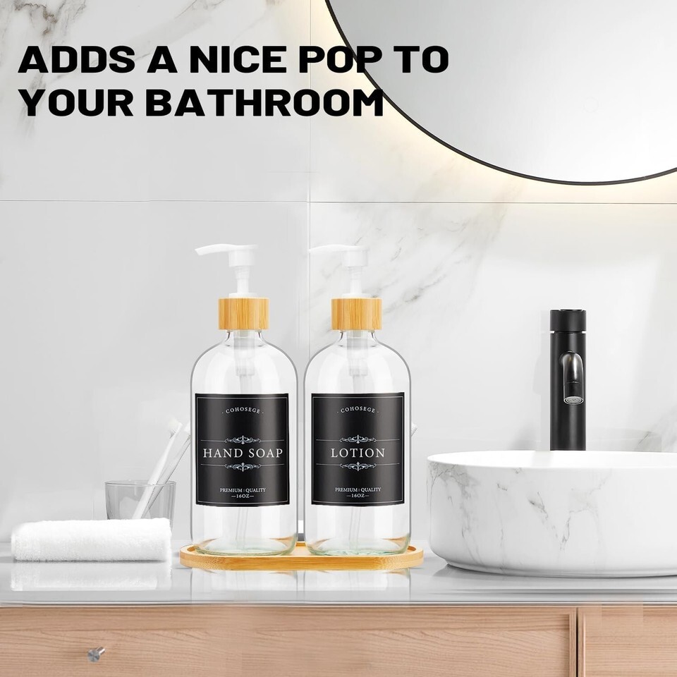 16oz Premium Clear Glass Soap Dispenser Bamboo Tray and Pump (2 Pack 8 Label)
